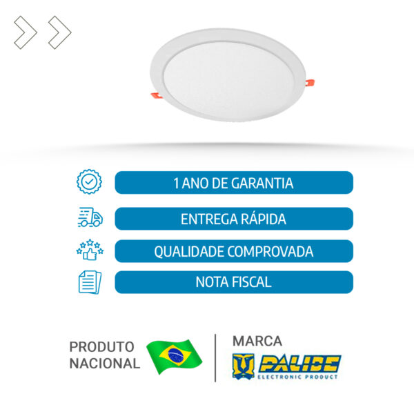 A instalação é simples e prática, pois o produto já acompanha suporte, driver bivolt, parafusos e buchas. Por fim, a Palide assegura controle de qualidade rigoroso, entrega rápida, garantia de 1 ano e nota fiscal, transmitindo confiança e segurança na sua compra.