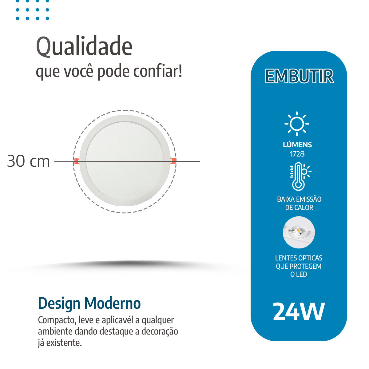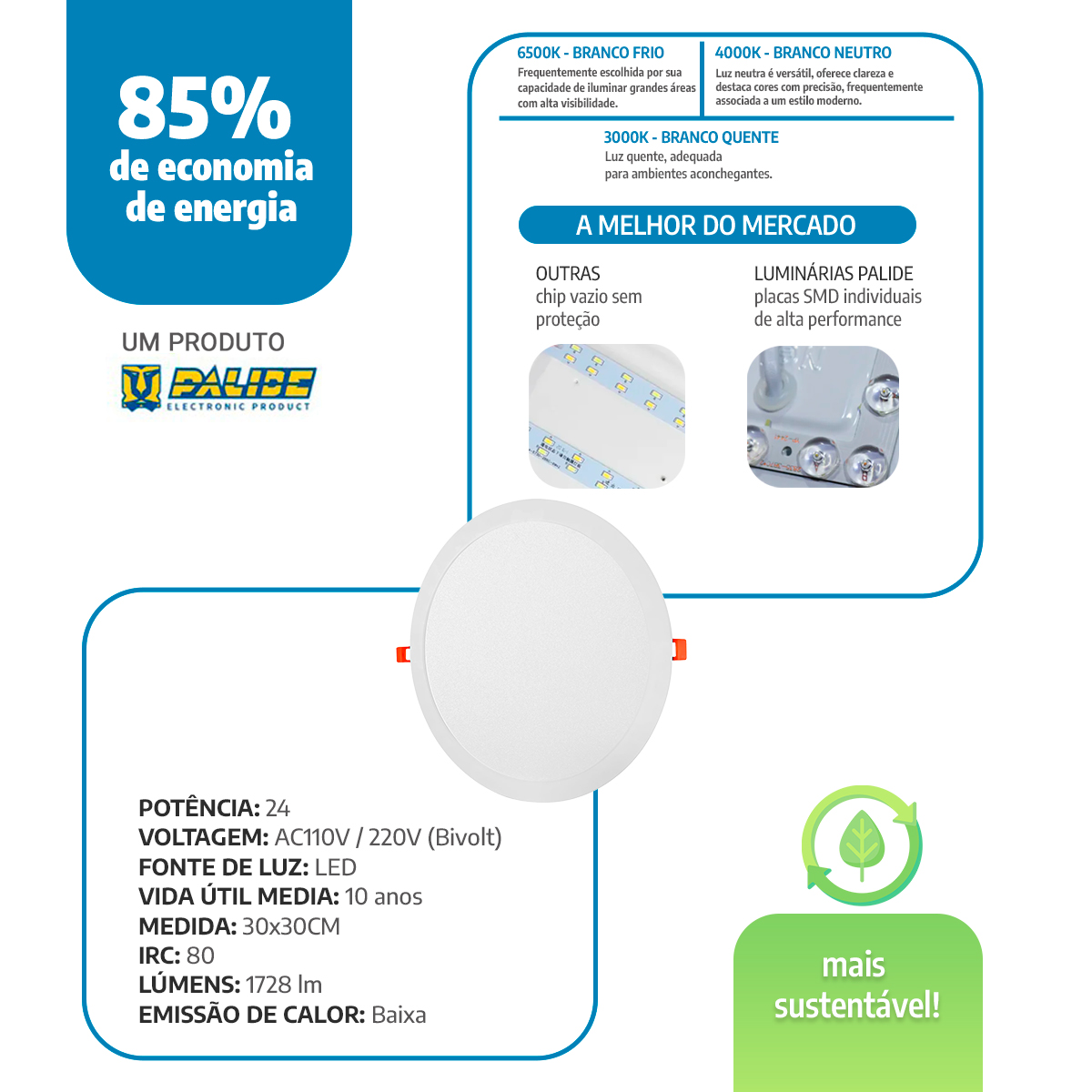 Em resumo, o Painel LED Palide 24W embutir redondo é econômico, duradouro e moderno, oferecendo eficiência e elegância em um só produto.