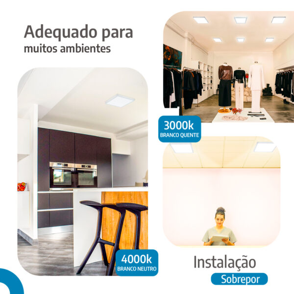 Disponível em luz quente (3000 K), o painel cria um clima acolhedor em quartos e salas de estar. Por outro lado, sua opção luz neutra (4000 K) é ideal para cozinhas, escritórios, lojas e corredores. Dessa forma, você tem versatilidade para iluminar diferentes espaços com conforto e funcionalidade, conforme o momento.