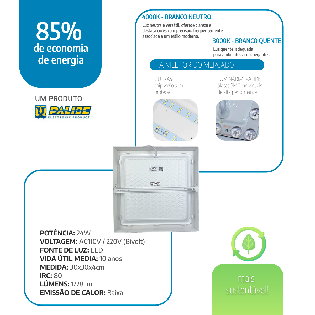 Construído no Brasil com padrão de qualidade rigoroso, este painel mantém a intensidade da luz por anos. Consequentemente, sua estrutura anti-inseto evita acúmulo de sujeira e prolonga a vida útil do produto — estimada em até 10 anos. Por fim, a Palide assegura praticidade com garantia de 1 ano e envio com nota fiscal.