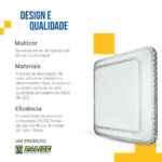 Com potência de apenas 24W, o plafon LED cristal 33×33 multicores entrega 2160 lúmens e garante até 80% de economia de energia. Portanto, você reduz os gastos mensais e, ao mesmo tempo, contribui para um consumo mais sustentável. Por outro lado, não precisa abrir mão da intensidade e do conforto da iluminação.