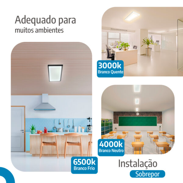 O painel acompanha driver, presilhas e parafusos. Portanto, basta encaixar e fixar rapidamente, sem complicações. Além disso, evita retrabalho em obras.