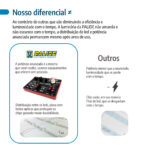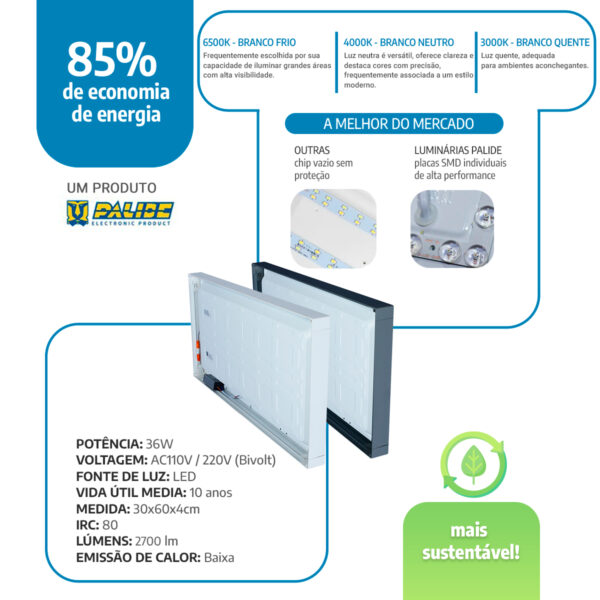 O corpo em alumínio garante resistência, enquanto as lentes ópticas aumentam a durabilidade. Logo, você adquire um painel confiável, pronto para uso contínuo por até 25.000 horas.