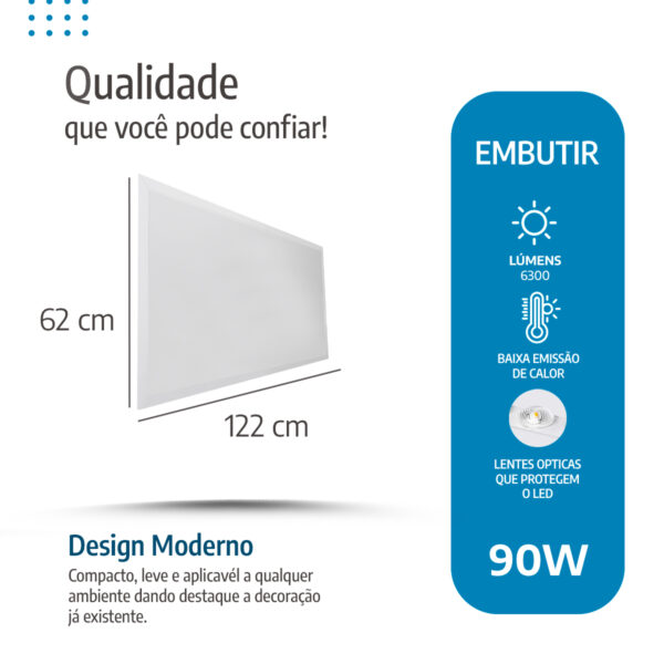 Com mais de 25.000 horas de vida útil e redução de até 85% no consumo de energia, o painel LED 62×122 embutir se posiciona como uma solução confiável e sustentável.