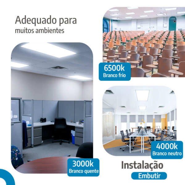 Disponível em 3000 K (aconchegante), 4000 K (neutro) e 6500 K (claro), esse painel adapta a iluminação com praticidade.