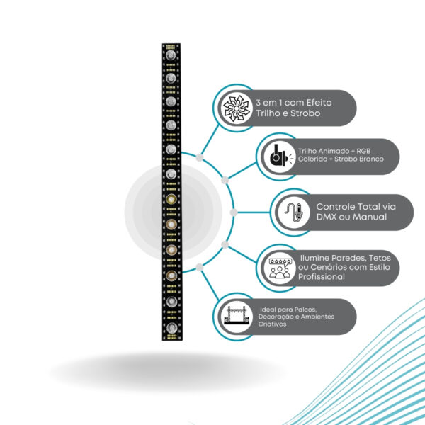 Ilumine com exclusividade. A Barra LED RGB 3 em 1 com efeito trilho e strobo é a escolha ideal para quem deseja destacar paredes, cenários, palcos ou tetos com luz criativa, potente e multifuncional. Este equipamento é completo, moderno e oferece total controle de efeitos para eventos profissionais, produções visuais e espaços temáticos.
